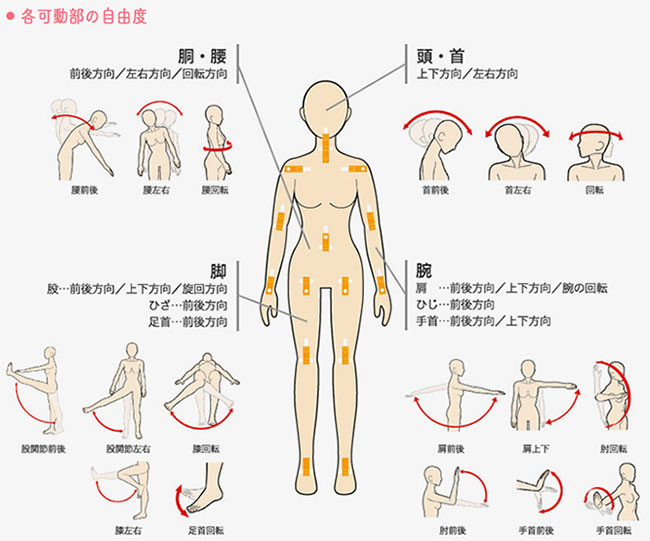 1.造形・触り心地・機能 リアルな造形で、触り心地も人間のように柔らかく、気持ちが良いです。関節部に特殊な人工複合金属を使用し、より自然で自由なポージングを可能にしました。